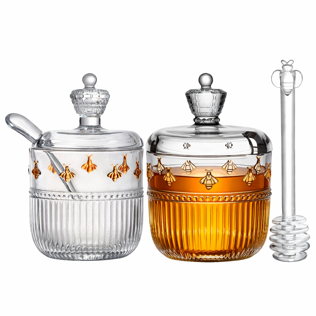 Produzidos em cristal pintado à mão, as peças trazem o delicado design de abelhinhas em tom âmbar, agregando elegância e personalidade ao seu café da manhã ou chá da tarde.